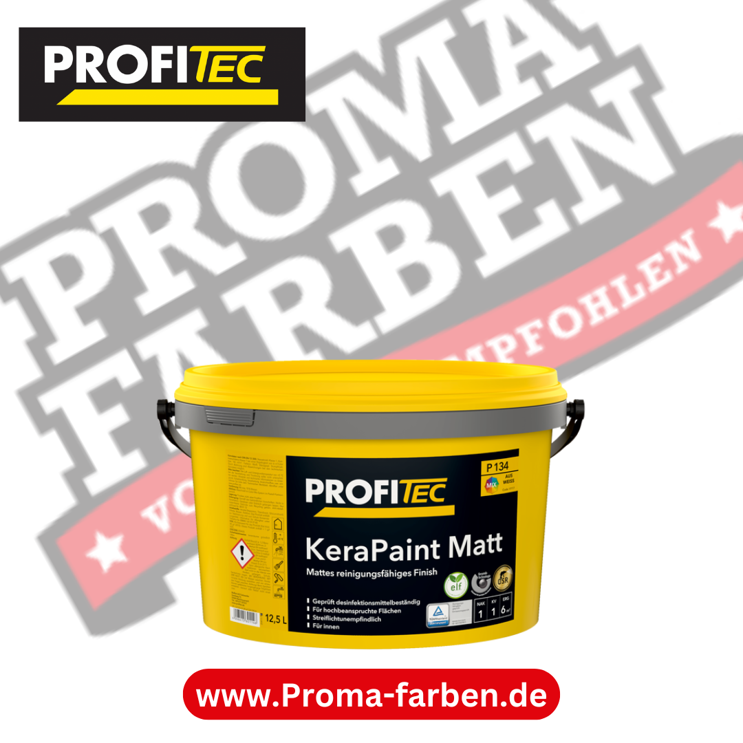 Mit der ProfiTec P 134 KeraPaint Matt entscheiden Sie sich für eine hochwertige, stumpfmatte Innenfarbe mit keramischen Micropartikeln – entwickelt für hoch beanspruchte Flächen und ein mattes, besonders reinigungsfähiges Finish. Die Farbe ist streiflichtunempfindlich, ansatzfrei verarbeitbar, diffusionsfähig sowie emissionsminimiert und frei von Lösemitteln und Weichmachern. Zudem ist sie geprüft desinfektionsmittelbeständig und eignet sich auch für Bereiche mit erhöhten Hygieneanforderungen.